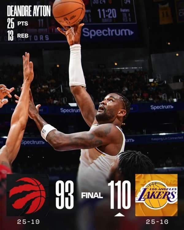110-93,昨日常规赛,湖人主场大比分击败猛龙。