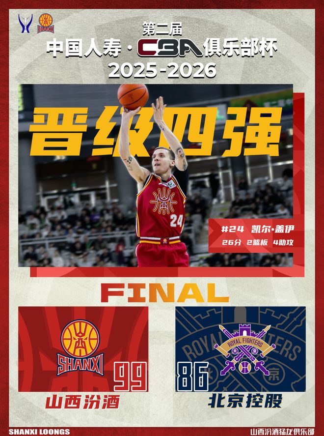 北京时间2026年2月7日19:30,第二届中国人寿·CBA俱乐部杯决赛阶段继续进行,山西汾酒在伊泰·呼和浩特内蒙古体育馆,迎来与北京控股的1/4决赛对决。本场比赛,山西队上半场处理球急躁,防守端出现太多无畏的犯规,中场调整后,全队在攻防两端均有明显改善,进攻明确,防守积极,并且在末节展现出足够韧劲,最终取得胜利,全场比赛结束,山西汾酒99:86战胜北京控股,成功晋级四强。