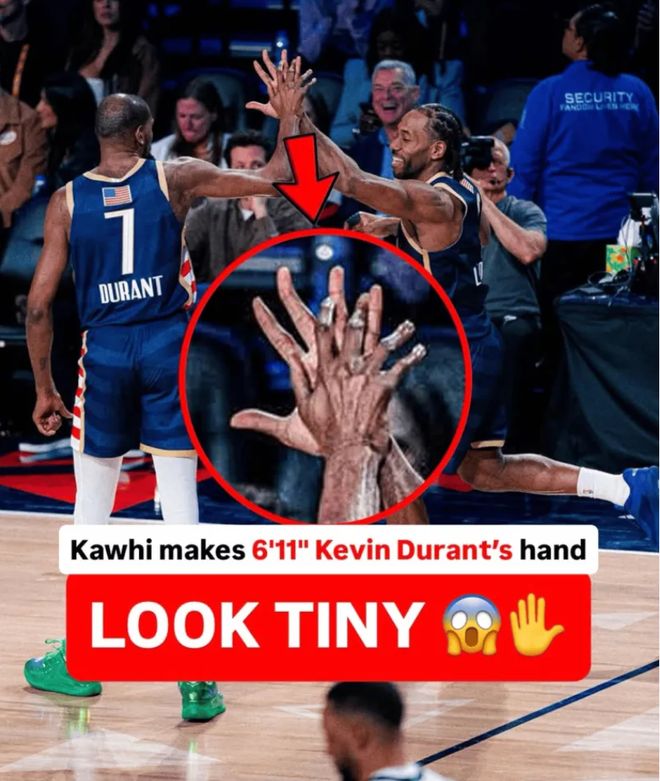 科怀-伦纳德在全明星正赛是大放异彩,尤其是他与凯文-杜兰特击掌的一个瞬间,他的手掌足足比杜兰特大了一圈,根据NBA官方的数据,伦纳德手掌宽度28.5cm-29cm,手掌长度是24.75cm-24.8cm,杜兰特一直以来都是联盟知名的小手掌。