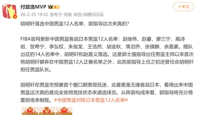 相比于此前的14人名单,胡明轩与赵嘉义两人遗憾没能入选最终的12人大名单。