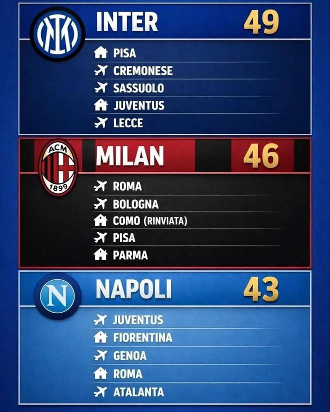 而如果对比意甲前三名球队最近5轮的联赛赛程,就能发现这对于国米来说也是关键赛段!国米最近5轮只有尤文一支强队,而且还坐拥主场优势,有望报首回合失利之仇,其他四个对手比萨、克雷莫内塞、萨索洛和莱切实力都不算强,即便客场作战,拿下对手应该也不会有太大问题。