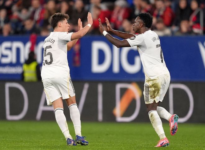 比分落后的皇家马德里,在重新回到赛场之后,大举压上围攻奥萨苏纳,第73分钟巴尔韦德正面强突,杀入对方腹地之后,无私横传门前,维尼修斯包抄建功,将比分追至1平,凭借此球熊皇将自己的西甲进球数提升到了70球,追平了巴萨名宿罗纳尔迪尼奥。
